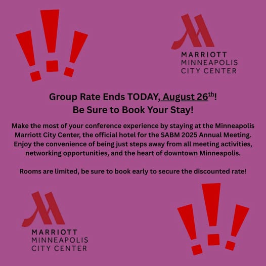 HOTEL CUT OFF ENDS TODAY, AUGUST 26, 2025! The 2025 SABM Annual Meeting will take place at the Minneapolis Marriott City Center. Minneapolis Marriott City Center 30 S. 7th Street Minneapolis, MN 55402 To reserve your hotel room: https://book.passkey.com/event/50966793/owner/1070/home?utm_campaign=296398583 (fb)