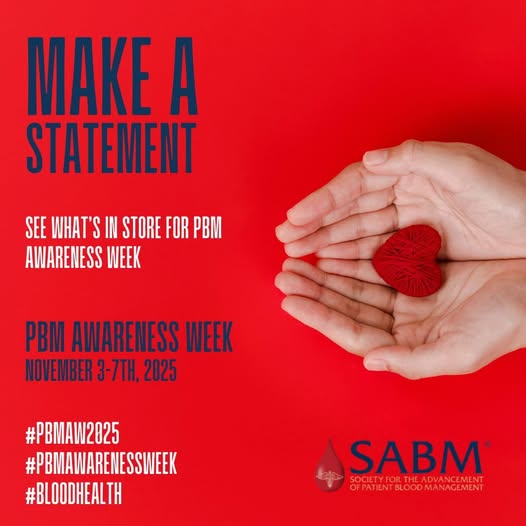 Patient Blood Management Awareness Week is coming up, November 3-7, 2025! Blood Health education benefits everyone. Please mark your calendars for this important week! https://www.sabm.org/pbm-awareness-week (fb)