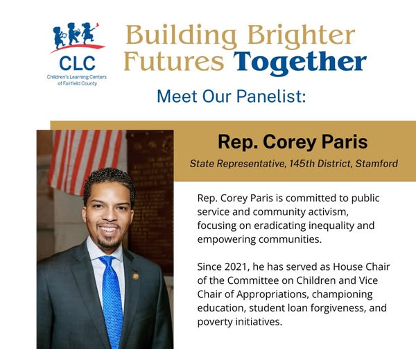 Meet another inspiring voice on our panel! Join us for Building Brighter Futures Together on Thursday, Oct 30 • 8:00 AM at The Village, Stamford. Meet Our Panelist: Rep. Corey Paris Rep. Paris has a long-standing connection with CLC and is a passionate advocate for children and early childhood education. Since 2021, he has served as House Chair of the Committee on Children and Vice Chair of Appropriations, championing education, student loan forgiveness, and poverty initiatives. Free admission. Register now! https://lnkd.in/eWTyCZFp) (fb)