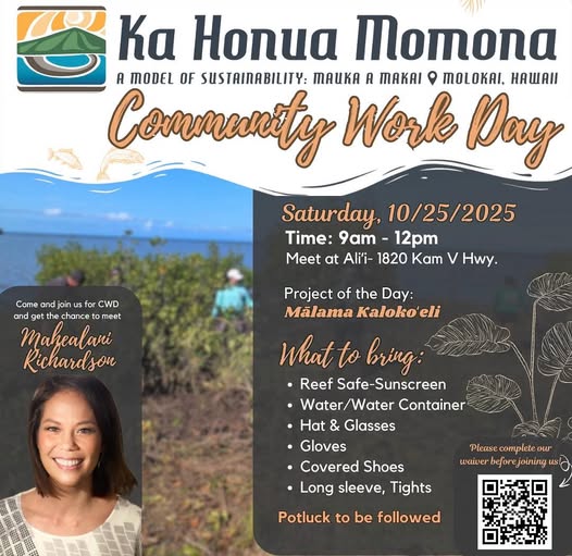 Aloha Kākou! 🌺🌊🐠 Join us this Saturday, October 25, 2025 from 9am-12pm for our Community Workday. Come lend a hand as we mālama (care for) our ‘āina and learn together as a community. We’re excited to welcome Mahealani Richardson from Hawaii News Now, who also serves as a proud member of KHM’s Board of Directors. 🗓️When: Saturday, 10/25/25 📍Where: Meet at Ali’i Loko I’a- 1820 Kam V Hwy. ⏰Time: 9am-12pm #KHMInternstional #Molokai #CommunityWorkday #MalamaAina #Kalokoeli #AlohaInAction #HawaiiNewsNow #Kuleana (fb)