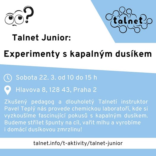 Přidejte se k nám na jedinečný workshop plný pokusů s kapalným dusíkem! 💨 Pod vedením zkušeného instruktora Pavla Teplého budeme: ✅ Střílet špunty na cíl 🎯 ✅ Vařit mlhu ☁️ ✅ A dokonce si vyrobíme dusíkovou zmrzlinu! 🍦❄️ Přihlaste se na webu: https://talnet.info/2025/02/25/talnet-junior-experimenty-s-kapalnym-dusikem/ 📅 Kdy? Sobota 22. 3. | 10:00–15:00 📍 Kde? Hlavova 8, Praha 2 🎒 Co s sebou? Přezůvky, velkou svačinu a pití 💰 Cena? 300 Kč Nenechte si ujít tuhle mrazivě skvělou příležitost! 🔥❄️ (fb)
