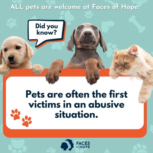 At Faces of Hope, we understand that pets provide comfort and support. All pets, whether registered support animals or not, are welcome here. Abusers often use threats or harm towards their victim's pets to exert power and control before becoming physically violent with the victim. The National Coalition Against Domestic Violence reports that 40% of domestic violence victims do not leave their abuser out of concern for their pet's safety. Unfortunately, many domestic violence shelters do not allow pets. (fb)