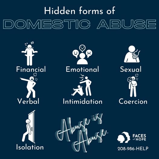 It's still abuse, whether it's visible to those outside your home or not. Domestic violence doesn't always leave visible bruises. Recognizing signs of domestic violence that are often hidden can be challenging, but seeking help is crucial to prevent continued harm to you and/or your family. If you or someone you know is experiencing abuse, we are here for support and safety. www.facesofhopeidaho.org (fb)
