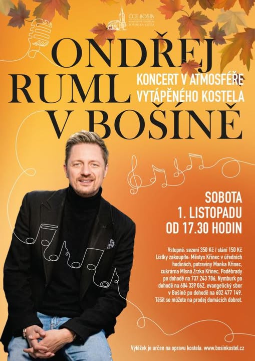 Dokonalá sobota plná kultury? Začněte ji u nás na zámku a zakončete hudbou v Bošíně ❤️🎤 Dopoledne si přijďte užít komentovanou prohlídku našeho zámku, pochutnejte si na výborném obědě a poté si odpočiňte v klidném parku nebo se ztraťte v našich labyrintech. A večer? Večer zamiřte do nedalekého Bošína, kde v tamním kostele vystoupí Ondřej Ruml. Koncert probíhá na podporu přeměny kostela v komunitní centrum – svým příchodem tak nejen prožijete výjimečný hudební zážitek, ale zároveň podpoříte smysluplný projekt. ❤️⛪️ Více info na https://www.bosinkostel.cz/budouci-deni (fb)