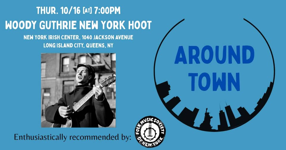 The annual Woody Guthrie New York Hoot will take place on Thurs. Oct. 16 at 7:00pm! With its roots going back 24 years, the Woody Guthrie New York Hoot is a two hour round robin songfest featuring a few of the 3,000+ songs that Woody Guthrie sang. Born in Okemah, Oklahoma, in 1912, Woody made New York City his home off and on from 1940 until his death from Huntington’s disease in 1967 at the age of 55. This year’s performers include Pat Lamanna, Joel Landy, Marie Mularczyk O’Connell, Anne Price, and Steve Suffet. Each is an established artist in his or her own right, and all are longtime Woody Guthrie admirers. At and sponsored by the New York Irish Center. 1040 Jackson Avenue. Long Island City, Queens, NY. Near the Vernon-Jackson subway station. Supported by the Folk Music Society of New York. Admission $15. For information visit NewYorkIrishCenter.org or call 718-482-0909. (fb)