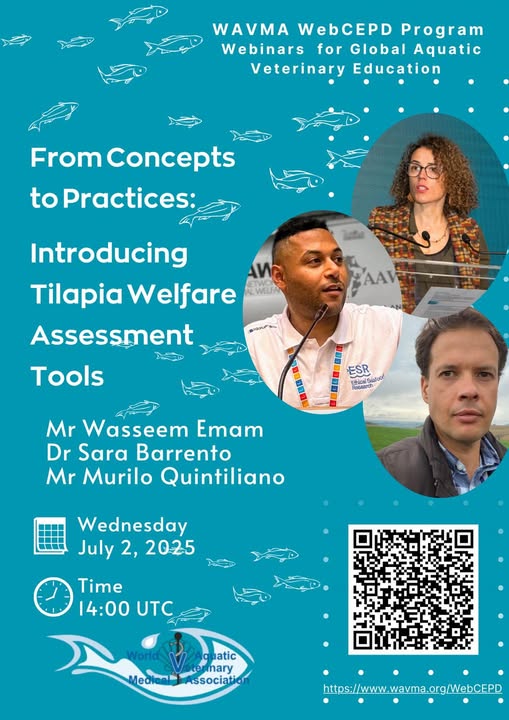 💥SAVE THE DATE!!🐠🐟🐡 Next week we will have an interesting webinar. We are delighted to have 3 exceptional invited speakers Wasseem Emam Sara Barrento and MURILO QUINTILIANO introducing Tilapia Welfare Assesment tools - From Concepts to Practices. Join us on Wednesday July 2, at 14:00 UTC. For registration visit https://www.wavma.org/Webinars/b1093from-concepts-to-practices-introducing-tilapia-welfare-assessment-tools-81729 or just click on the QR code below. #WAVMA #FishWelfare #Tilapia (fb)