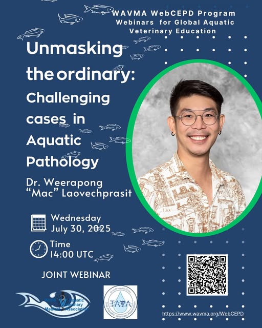 SAVE THE DATE!!🤩 Our next WAVMA webinar will be a Joint webinar with TAVA - Thai Aquatic Veterinary Association. We are delighted to have Dr Weerapong “Mac” Laovechprasit with a fascinating lecture on challenging cases in Aquatic Pathology🐠🐠 Date: Wednesday July 30 Time: 14:00 UTC For more information and registration please visit https://www.wavma.org/Webinars/b1094-unmasking-the-ordinary-challenging-cases-in-aquatic-pathology-06848 or the QR below. #aquaticpathology #aquaticveterinarymedicine #fishdisease (fb)