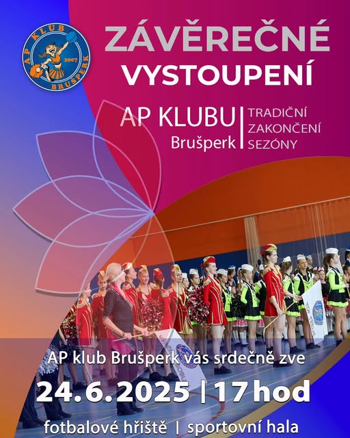 👋Zdravíme všechny fanoušky AP klubu! 🩷Srdečně vás zveme na naše Závěrečné vystoupení, které se uskuteční 24. června od 17:00 hodin. 👀Přijďte se podívat, co jsme se za celý rok naučily a rozloučit se s námi se sezónou...🥹 Místo konání se bude odvíjet od počasí: ☀️Pokud bude hezky, sejdeme se na fotbalovém hřišti. 🌧V případě deště se potkáme ve sportovní hale. 📅Tak si to zapište do kalendáře a přijďte za námi. Těšíme se na vás! #apklubbrusperk (fb)
