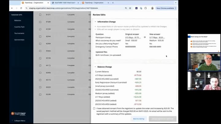 Want a quick look 🎥 at the newest TeamSnap Registration updates? TeamSnap's Jim Dahline walks through the latest enhancements in this short live #demo. Here’s what’s new: 📝 Dynamic Form & Document Updates: Administrators can now edit submitted info like uniform size or uploaded waivers without requiring families to re-register. Everyone gets automatically notified of the changes. 💳 Adjustable Fees Post-Registration: Late add-ons or changes? Fee differences are recalculated instantly and synced with updated payment plans. 📆 Payment Plan Flexibility: Need to adjust a payment plan? Admins can now modify dates, amounts, or even add new installments after registration is submitted. #TeamSnap #YouthSports #ProductUpdate #SportsTech #Registration (fb)