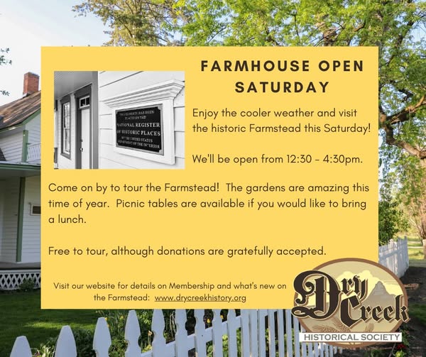 Come on by tomorrow! Visit our website for details on the Farmstead. https://www.drycreekhistory.org/ (fb)