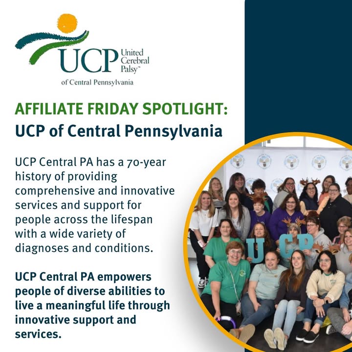 🌟 Affiliate Spotlight: UCP of Central Pennsylvania 🌟 For over 70 years, UCP of Central Pennsylvania has been opening doors to independence, opportunity, and inclusion for people with disabilities. Through a wide range of support services, from early intervention and assistive technology to residential and day programs, they help individuals live life without limits every single day. We’re proud to have UCP of Central PA as part of our affiliate network, championing choice, dignity, and possibility across the region. Visit www.UCPCentralPA.org to learn how they’re making a difference every day. . . . #UnitedCerebralPalsy #UCPUnited #AffiliateFriday SupportOurMission #LifeWithoutLimits #Nonprofit #InclusionMatters #DisabilityAdvocacy #DisabilityCommunity #TogetherWeCan #BreakBarriers #AbilityNotDisability (fb)
