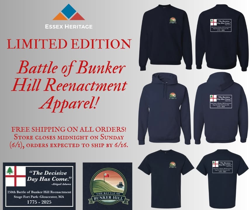 The decisive day has come... to order your commemorative attire! A crewneck, hoodie, and t-shirt commemorating the 250th anniversary of the Battle of Bunker Hill are now available. Shipping is free and a portion of each purchase is donated to the June 21-22 reenactment. These sweatshirts and shirts are only available for a short time so act fast! Browse here: https://www.shirtsillustratedsalem.com/collections/battle-of-bunker-hill Revolution250 City of Gloucester, MA Maritime Gloucester Discover Gloucester 250th Anniversary Battle of Bunker Hill Reenactment #MA250 #Massachusetts250 #Rev250 #Patriots #RedCoat #Revolution #AmericanRevolution #RevolutionaryWar #UnitedStates #13Colonies #ColonialHistory #AmericanColonies #ColonialAmerica #American #NewEngland #History #HistoricalEvent #BunkerHill #BattleOfBunkerHill #Gloucester #GloucesterMA (fb)
