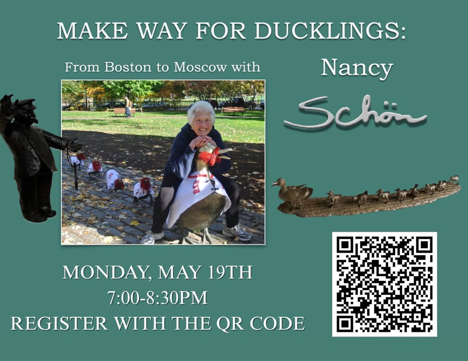 Happening tonight! World-renowned sculptor, Nancy Schön, will be at the Wellesley Free Library showcasing her documentary- Make Way For Duckings: From Boston to Moscow and holding a Q&A. Schön is best known for her work titled 'Make Way for Ducklings,' installed in 1987 in the Boston Public Garden, as well as, ‘Reach for Knowledge’ installed in 2023, at our very own Wellesley Free Library. Monday, May 19th from 7:00pm-8:30pm. Sign up with the QR code below or at https://wellesleyfreelibrary.libcal.com/event/14500895 (fb)