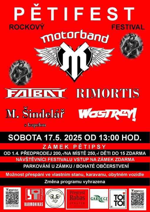 Zámek Pětipsy se promění v rockové peklo! Připravte se na řezavou dávku kytarových riffů a dunění bicích, které otřese i zámeckými duchy! Pětifest vtrhne na zámek Pětipsy v sobotu 17. května 2025 od 13:00 hodin a rozpoutá rockovou apokalypsu. Na pódiu vás čeká bestiální nálož pořádné muziky: • Motorband - nezničitelná legenda, která vám ukáže, jak se hraje pravej rock! • Rimortis - přímočarej metalovej nářez, bez kompromisů! • FatBat - metalová síla, co vám propláchne uši pořádnou dávkou decibelů! • Michal Šindelář s kapelou - syrová energie a rockový feeling, co vás dostane do varu! • Wostrey – dravá kapela, co ukáže, že rock ještě neřekl poslední slovo! Nečekejte na nic a přijďte si pro pořádnou dávku rockové terapie v unikátním prostředí zámku. Pětifest – kde se rodí rocková legenda! Sobota 17. května 2025 od 13:00 hod., zámek Pětipsy. Buďte tam, nebo litujte!🤘 (fb)