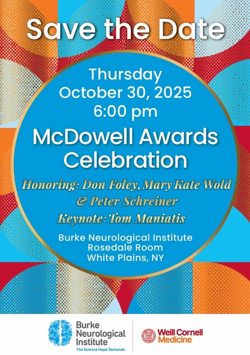 Each year, the Burke Neurological Institute proudly honors three exceptional individuals whose dedication to overcoming neurological disability reflects the values and mission Dr. McDowell championed. This year, we celebrate the extraordinary contributions of Donald Foley, Mary Kate Wold, and Peter Schreiner —whose work and participation continues to propel the field forward. Join us at the Burke Neurological Institute Rosedale Room on Thursday, October 30, 2025, at 6:00 pm as we honor their impact and reaffirm our shared commitment to a future where neurological disability is not a foregone conclusion, but a challenge science can overcome. Thank you in advance for your support and stay tuned for more information about our McDowell Awards Celebration. For more information visit: https://buff.ly/GR38Be0 RVSP at: https://buff.ly/BfGVXt1 (fb)