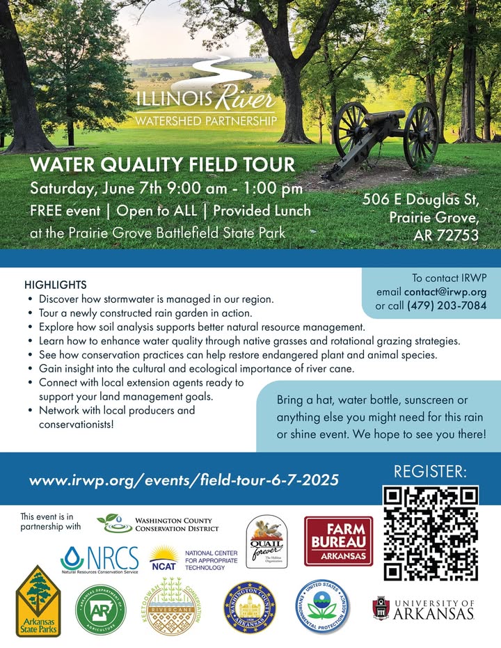 Our Mission The Illinois River Watershed Partnership is a nonprofit that works to improve the integrity of the Illinois River Watershed through public education outreach and implementation of conservation and restoration practices throughout the watershed. Protecting natural resources in our rapidly urbanizing region. Did you see a Billboard. This is Your Watershed Landowners and residents of Fayetteville Bentonville Rogers Springdale Lincoln Farmington Tontitown Prairie Grove Lowell Cave Springs Elm Springs and Siloam Springs all the way over to Tahlequah Oklahoma you live in the Illinois River Watershed.