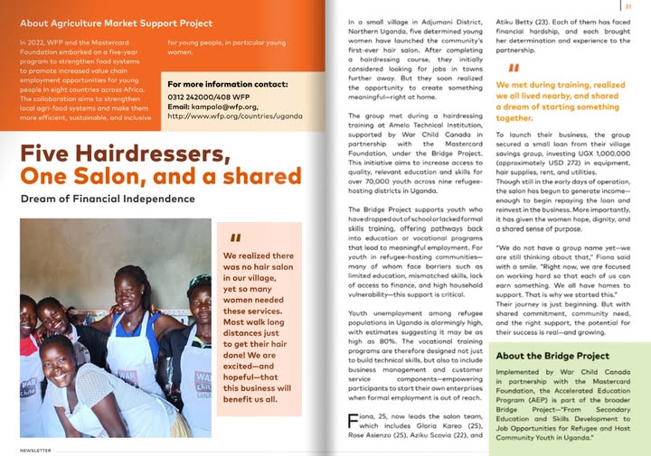 What does possibility look like when young people are given the tools, skills, and opportunities to thrive? War Child works with young people in Uganda to support continued learning, apprenticeships, and job readiness. We’re part of the Mastercard Foundation Young Africa Works Community of Practice—and this Uganda Digest – Issue 2 - features stories of transition - from informal jobs to sustainable careers, from exclusion to inclusion, and from survival to leadership. Meet entrepreneurs, scholars, and community changemakers who are uplifting others as they not only redefine their futures. Our #BRIDGE program is featured on page 30! Check it out! bit.ly/FdnUgDigest2 #YoungAfricaWorksUgDigest #MastercardFoundation #YoungAfricaWorks (fb)