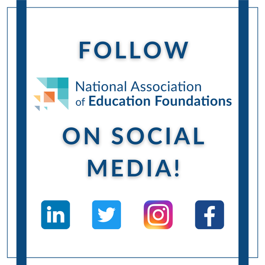 Have you followed the National Association of Education Foundations, Inc., on social media? Here, you can stay up to date on upcoming events, job postings, resources, and much more! Facebook- National Association of Education Foundations, Inc. LinkedIn- National Association of Education Foundations, Inc. Twitter- @educationfdns Instagram- @educationfoundations (fb)