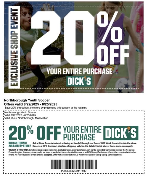Today 8/25 is the LAST DAY for 20% in-store at DICK'S Sporting Goods in Northborough! Did your player outgrow their cleats? Or maybe you need some outfits for back to school. This is the perfect time to shop! **must present coupon at the register when checking out** (fb)
