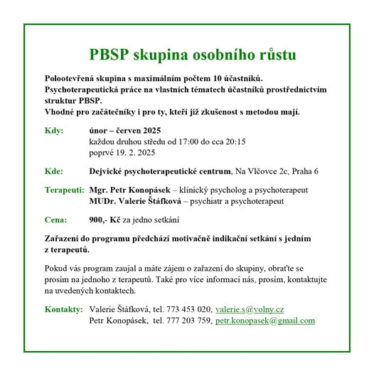 Ve středu 19. 2. 2025 začíná další skupina PBSP. Máte-li zájem, obraťte se na jednoho z terapeutů. (fb)