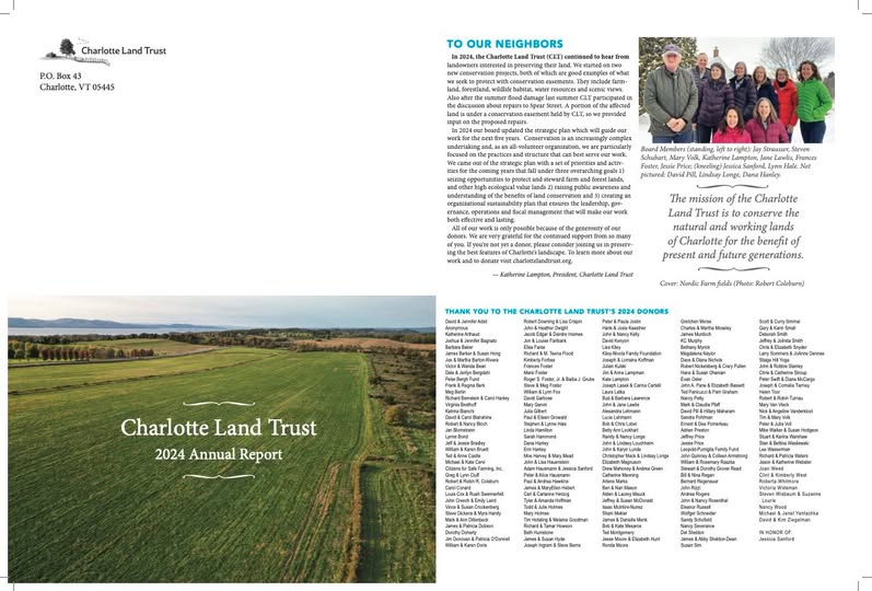 Donate The mission of the Charlotte Land Trust is to conserve the natural and working lands of Charlotte for the benefit of present and future generations News Thank You. All of us at the Charlotte Land Trust are deeply grateful for your donations and kind words of support to us this past year. Your generous donations make possible all the fine work we do in Town. Thank you so much.