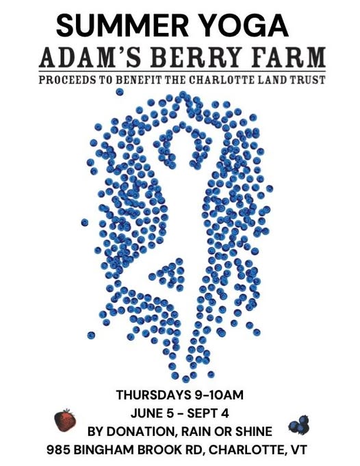 We are pleased at announce that Lynn Alpeter and Adams Berry Farm is again generously sponsoring a summer yoga class series at the farm to benefit the Charlotte Land Trust. We hope to see you there. (fb)