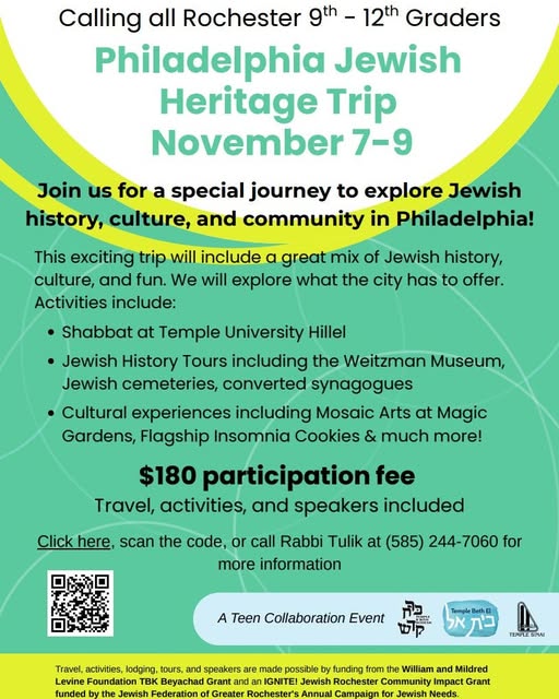 Temple B'rith Kodesh Philly Bound! 🇺🇸✡️ Rochester-area Jewish teens — join us Nov 7–9 for an unforgettable weekend in Philadelphia! 🏛️ Weitzman Jewish History Museum 🎓 Temple University Hillel 🕍 Shabbat at Rodeph Shalom 🎨 Mural arts & Liberty Bell 🏀 76ers game A weekend of Jewish pride, new friendships, and Philly fun! Open to all Jewish high schoolers. Register here: https://docs.google.com/forms/d/e/1FAIpQLSdH5ccvdeAu_brWZv1FP2VQk24FCZ5TAilu8dPn5LldqCIn9w/viewform?pli=1 (fb)