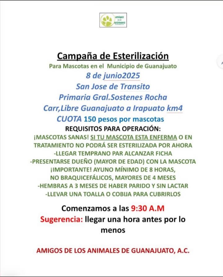 8 de Junio 2025 RECUERDA IMPORTANTISIMO !!!! NO BRAQUICEFÁLICOS porfavor! El ayuno no puede ser menor a 8 hrs. Si tu mascota esta enferma o en tratamiento no puede ser esterilizada en este momento. También tendremos algunas actividades para los niños!!! 🚨 𝗖𝗨𝗣𝗢 𝗟𝗜𝗠𝗜𝗧𝗔𝗗𝗢 🎟 𝗦𝗲 𝗮𝘀𝗶𝗴𝗻𝗮𝗻 𝘁𝘂𝗿𝗻𝗼𝘀 𝗱𝗲 𝗮𝘁𝗲𝗻𝗰𝗶ó𝗻 𝗲𝗻 𝗯𝗮𝘀𝗲 𝗮 𝗟𝗔 𝗛𝗢𝗥𝗔 𝗗𝗘 𝗟𝗟𝗘𝗚𝗔𝗗𝗔 , 𝗦𝗘𝗫𝗢 ESPECIE 𝗗𝗘 𝗟𝗔𝗦 𝗠𝗔𝗦𝗖𝗢𝗧𝗔𝗦 𝗤𝗨𝗘 𝗦𝗘𝗥Á𝗡 𝗢𝗣𝗘𝗥𝗔𝗗𝗔𝗦 👀 Informamos que los tiempos y la prioridad de los turnos pueden ser afectados por las complejidades que en ocasiones surgen durante algunas de las cirugías. Así que atentamente les recomendamos 𝗮𝘀𝗶𝘀𝘁𝗶𝗿 𝗮 𝗹𝗮 𝗰𝗮𝗺𝗽𝗮ñ𝗮 𝗣𝗥𝗘𝗣𝗔𝗥𝗔𝗗𝗢𝗦 𝗣𝗔𝗥𝗔 𝗣𝗘𝗥𝗜𝗢𝗗𝗢𝗦 𝗗𝗘 𝗘𝗦𝗣𝗘𝗥𝗔 𝗣𝗥𝗢𝗟𝗢𝗡𝗚𝗔𝗗𝗢.. @seguidores Recuerden importantísimo!! . NO BRAQUICEFÁLICOS( PERROS CHATOS) El ayuno no puede ser menor a 8 hrs. Si tu mascota esta enferma o en tratamiento no puede ser esterilizada en este momento. También tendremos algunas actividades para los niños!!! @seguidores Checa el vídeo de como hacer la faja pos operatoria! https://www.facebook.com/share/p/1LCBdJhhMB/ (fb)