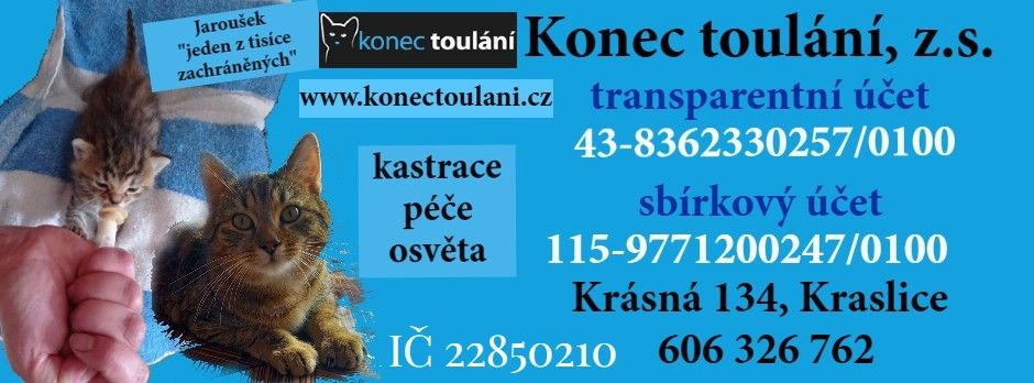 KB č. ú. : 43-8362330257/0100 Vítejte na našich stránkách Poskytujeme přechodný domov nalezeným nebo týraným kočičkám. Azyl u nás naleznou i zvířata, o která se již jejich majitelé z různých důvodů nemohou starat.
