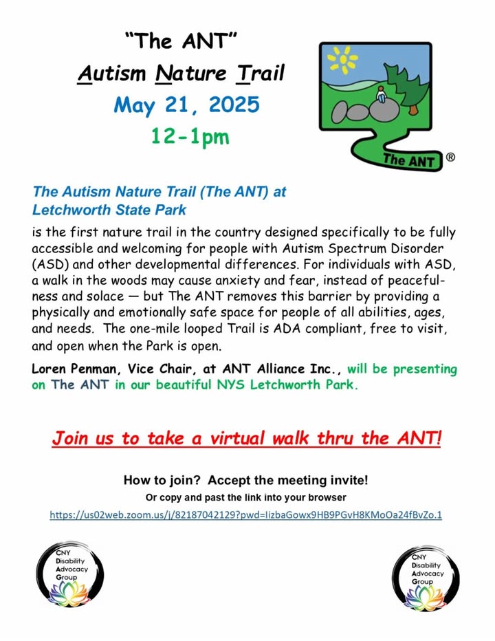 Don't miss this awesome chance to virtually stroll through The Autism Nature Trail at Letchworth State Park with the amazing Loren Penman, Vice Chair at ANT Alliance Inc. 🏞🥾 Click the link below and join the fun at 12 PM on May 21st! 🔗https://us02web.zoom.us/j/82187042129?pwd=IizbaGowx9HB9PGvH8KMoOa24fBvZo.1 Meeting ID: 821 8704 2129 Passcode: 480407 (fb)