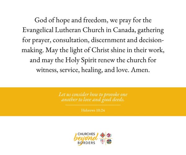 Our prayers are with the Evangelical Lutheran Church in Canada, as they meet for their National Convention, July 10-13. God of hope and freedom, we pray for the Evangelical Lutheran Church in Canada, gathering for prayer, consultation, discernment and decision-making. May the light of Christ shine in their work, and may the Holy Spirit renew the church for witness, service, healing, and love. Amen. Let us consider how to provoke one another to love and good deeds. — Hebrews 10:24 (fb)