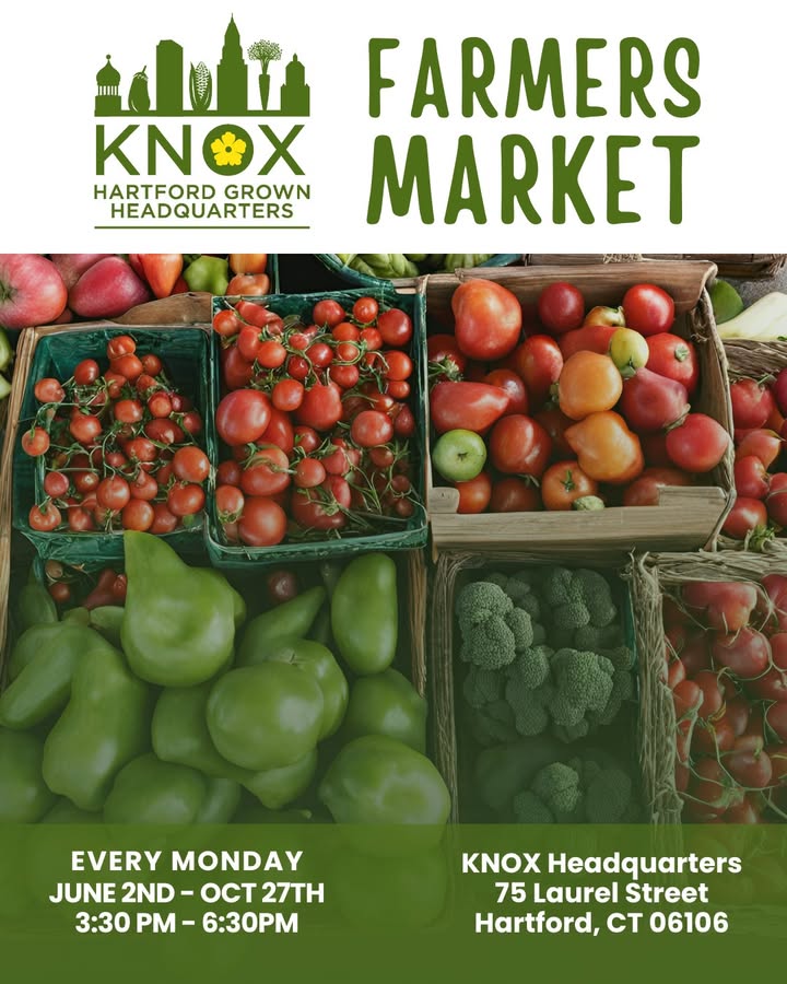 🌿 Join us for the KNOX Farmers Market & Plant Sale! 🗓 Every Monday, June 2 - October 27 | 3:30–6:30 p.m. 📍 75 Laurel Street, Hartford, CT 🧑🌾 Grab fresh, seasonal produce from our resident farmer, Derrick 🌱 Stock up on seedlings from our urban farmers—perfect for your summer garden 🌸 AND shop our colorful Plant Sale featuring vibrant potted flowers and lush hanging baskets—ready to take home and enjoy instantly! Whether you're planting, picking up something fresh to eat, or just adding a pop of color to your porch or patio, there's something for everyone. Come support local growers and kick off the season with fresh food and fresh blooms! #HartfordCT #FarmersMarket #PlantSale #SupportLocal #UrbanFarming #KNOXHartford #SummerVibes #GardenReady (fb)