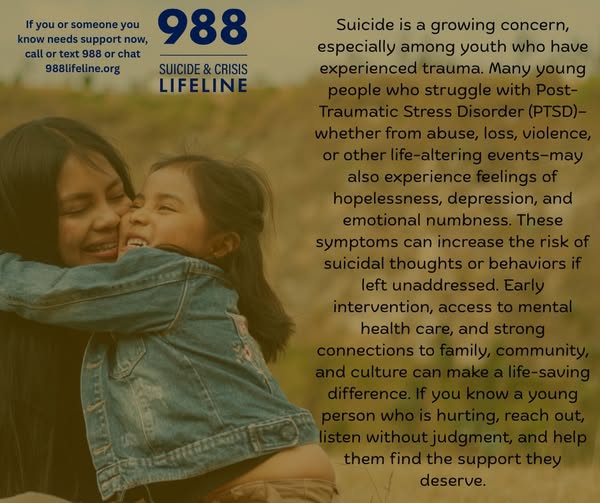 As National PTSD Awareness Month comes to an end, let's take a moment to reflect on the mental health of our Native Youth. PTSD can come in many forms, and it's important to acknowledge that children may experience it as well. For information on mental health resources for Native youth - contact Texas Native Health @ 214-941-1050 or contact the 988 crisis line if you suspect your child, friend, or family member may be at risk for suicide. (fb)