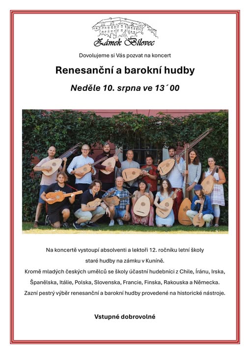 Pozvánka na zámek v Bílovci Koncert renesanční a barokní hudby Neděle 10. srpna ve 13.00 Na koncertě vystoupí absolventi a lektoři 12. ročníku letní školy staré hudby na zámku v Kuníně. Kromě mladých českých umělců se školy účastní hudebníci z Chile, Íránu, Irska, Španělska, Itálie, Polska, Slovenska, Francie, Finska, Rakouska a Německa. Zazní pestrý výběr renesanční a barokní hudby provedené na historické nástroje. (fb)