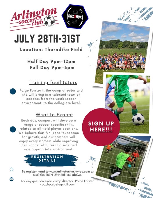Are you still looking for summer camp opportunities?? Well you're in luck....we have spaces still available for our July 29-31 camp. Join us this summer for the ASC Box2Box Soccer Camps — a high-energy, skill-focused program designed for youth players who want to sharpen their game and boost their confidence on the field. Organized and carefully designed by our Director of Coaching Paige Forster and delivered by her staff of experienced coaches. The camp’s theme is inspired by the name Box2Box, which reflects the complete journey of a field player—from defense to attack, across all thirds of the field. Throughout the week, we’ll focus on key areas of the game, including defending skills, midfield responsibilities, and the attacking mindset of a striker. Each session is designed to develop well-rounded, intelligent, and confident players. 🏟️ Camp Dates: Week 1 - 07/28/2025 - 07/31/2025 📍 Location: Week 1- Thorndike Park - Thorndike Field 🕘 Time: Half Day: 9am-12pm Full Day: 9am-3pm 👥 Ages: 6-14 Spots are limited, so don’t miss your chance to train in a fun, supportive, and competitive environment! 👉 Register now: https://arlingtonma.myrec.com/info/activities/program_details.aspx?ProgramID=29651 See you on the pitch! (fb)