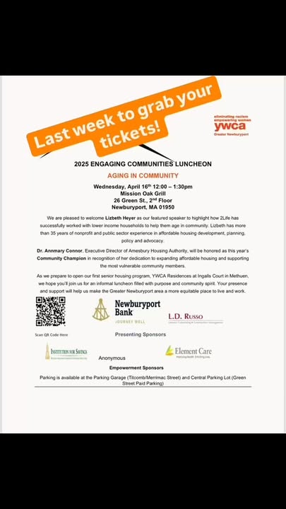 Save the Date Wednesday April 16 2025 YWCA Annual Engaging Communities Luncheon. 12 pm Mission Oak Grill. The Value of Aging in Place. YWCA Housing Choice Coalition Next meeting 31325 6 pm Newburyport Senior Center ADU Information Save the date Next Meeting March 13 2025 at 6 pm at the Newburyport Senior Center.