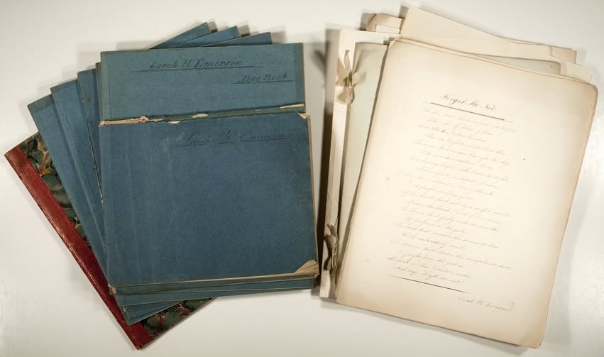 This collection of poems, essays and exercises contains more than two dozen items written by Sarah H. Emerson, a young woman living in the Boston area in the 19th-century. It includes a variety of materials which illustrate the range of educational activity and schoolwork which she was in engaged during the 1830s. Including 🖋️penmanship exercises (“Licentiousness in opinions, leads to licentiousness in practice”), 🖋️poems (“The Sleeping Infant,” “The Warrior’s Grave”), 🖋️essays (“Perserverence”), 🖋️and six daybooks and “legers” for hypothetical exercises in bookkeeping for a general store in Boston (!) The original poems, ribbon-bound pages, paired with the writing books vibe (🤩) made us think of back-to-school, but her original poetry also reminded us of a happy #NationalPoetsDay (to the known and unknown poets!) (fb)