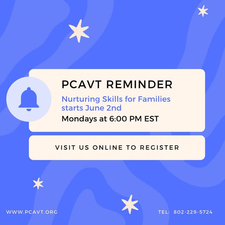 🌟Looking to build stronger, more connected family relationships? Our Nurturing Skills for Families class starts June 2nd and meets every Monday at 6:00 PM EST.🌟 ✨Join us online to gain practical tools, support, and guidance in a safe, welcoming space. Visit www.pcavt.org to register today! #parentingclass #nurturingfamilies #vermontfamilies #childabuseprevention #positiveparenting #familywellness #strongfamilies #pcavt #parentinghelp #onlineparentingclass #parentingsupport #familyconnections #nurturewithlove #vermontparents #supportforparents #emotionalintelligence #familygrowth #communitysupport #safeandhappychildhoods #parentingtips #gentleparenting #consciousparenting #familyresilience #mentalhealthsupport #parented #parenteducation #vermontnonprofit #familystrengthening #onlinelearning #mondaymotivation (fb)