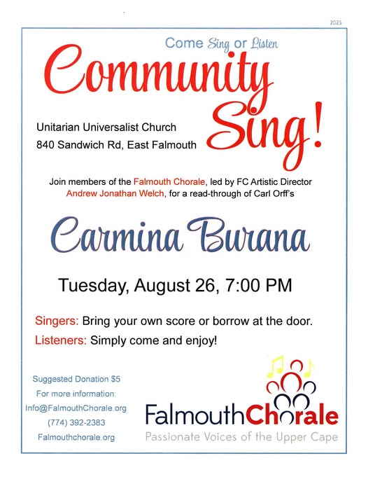 Join us for our annual Community Sing on Tuesday, August 26 at 7:00 PM. Bring a friend! (fb)