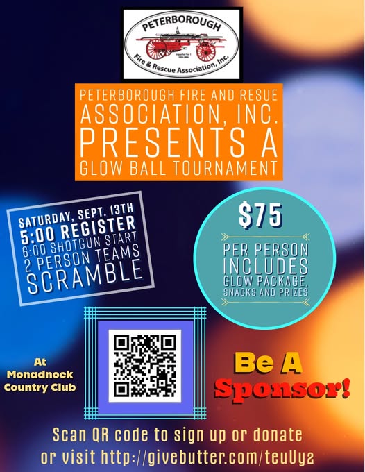 The Peterborough Fire and Rescue association would like to give a shout out to our wonderful sponsors for the First Annual Glow Golf Tournament! With this being our first event of this nature we were unsure of how it would go, but we are highly appreciative and thankful to the sponsors who made it possible and helped us raise approximately $7,000.00 after expenses. Title sponsorship: Peavy Family Dental Hole Sponsorships: Avenues Recovery Center K. Sweeney Construction LR3 American Steele Jellison Funeral Home Cowboy Concrete Rand’s Carpentry Service Thien Vien Bao Chon Heavy Haulers Mathewson Co. Our Town Dental Pizza Peddler Our Town Diner Cook’s Auto Supply Reilly Painting Hamlin Auto Edward Jones Bowling Acres Mi Jalisco Beepa and Lulu’s Scott Farrar Food Sponsorship: Monadnock Mobile Eats Prize Sponsorship: Ed Walker Glow Golf bag and supplies sponsors: Boutwell Land Management- Glow Balls Edward Jones- Glow Sticks Mathewson Co. - Draw String bags Raffle Sponsors: Beepa and Lulus Blue Seal Toad Stool Bookstore Mi Jalisco Edward Jones Huberts Monadnock Oil and Vinegar Bowling Acres Without your support we would not have been able to have had such a successful event! Thank you all for your support and we look forward to next year! (fb)