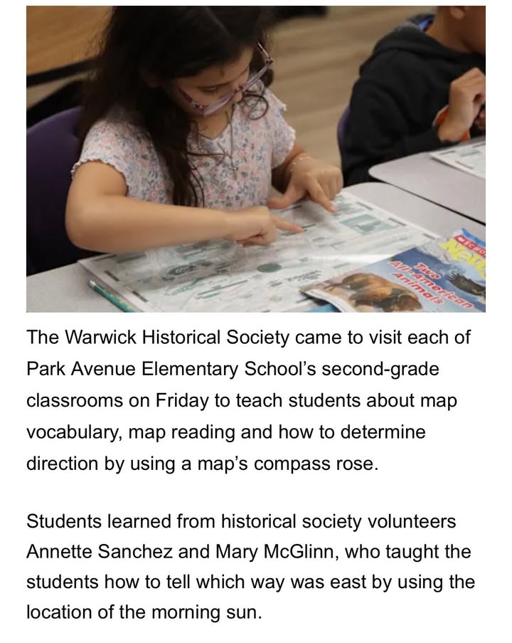 🌟 A huge thank you to the Warwick Valley Central School District for shining a spotlight on the Warwick Historical Society’s incredible Education Committee! 🌍🗺️ We’re so proud of our amazing volunteers, like Annette Sanchez and Mary McGlinn, who recently brought history to life for Park Avenue Elementary’s second graders. 👩🏫 Do you love history, education, or just the joy of seeing young minds light up with curiosity? Whether you're a retired teacher, a grandparent of a Warwick student, or someone who simply wants to make a difference — we’d love to have you join our Education Committee! 📞 Call us at 845-986-3236 or email admin@whsny.org to learn more about how you can get involved. Let’s keep inspiring the next generation — one map, story, and lesson at a time! 🧭📚✨ . . #WarwickHistory #WVCSD #EducationMatters #MapSkills #CommunityConnections #VolunteerWithUs #WHS #HistoricWarwick Full article: https://www.warwickvalleyschools.com/post-details-dbpp/~board/park-avenue-news-announcements/post/historical-society-teaches-park-students-about-map-reading (fb)
