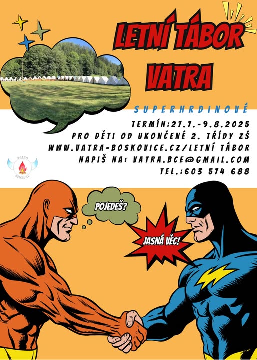 Milí Vatráci i milí rodiče, letošní tábor budeme Superhrdinové, je čas se přihlásit! Přihlášku a všechny potřebné informace najdete na našem webu: www.vatra-boskovice.cz/letni-tabor (fb)