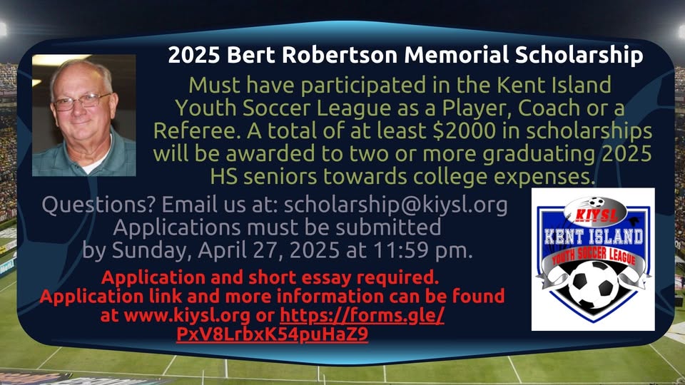 The 2025 Bert Robertson Scholarship is open for graduating HS seniors. The deadline for scholarship applications is 11:59 pm on Sunday April 27, 2025. Help us get the word out! Applications are only accepted through the online application found at https://forms.gle/PxV8LrbxK54puHaZ9. Winners will be announced in May. More details can be found here: https://kiysl.org/content/7647/Scholarship-Information (fb)