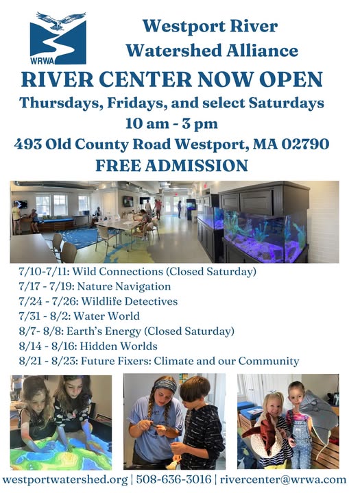 🌞 Summer fun is back at the River Center! 🌊 Join us at the Westport River Watershed Alliance River Center, open Thursdays, Fridays, and select Saturdays from 10 AM – 3 PM at 493 Old County Road, Westport, MA — and it’s all FREE! Each week features a new hands-on theme for all ages to enjoy: 🔹 7/10–7/11: Wild Connections (Closed Saturday) 🔹 7/17–7/19: Nature Navigation 🔹 7/24–7/26: Wildlife Detectives 🔹 7/31–8/2: Water World 🔹 8/7–8/8: Earth’s Energy (Closed Saturday) 🔹 8/14–8/16: Hidden Worlds 🔹 8/21–8/23: Future Fixers: Climate and Our Community Bring your curiosity and come explore the wonders of our watershed! 💧🌍 (fb)