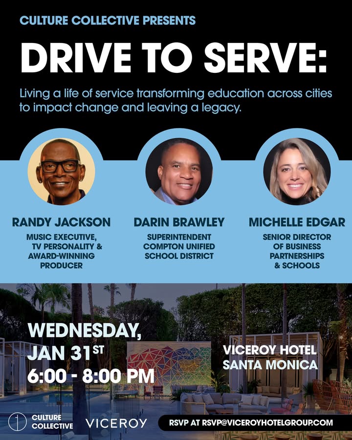 Excited for my next Culture Collective event Viceroy Santa Monica: DRIVE TO SERVE: Living a life of service transforming education across cities to impact change and leaving a legacy featuring Randy Jackson Compton Unified School District Superintendent Darin Brawley. Proud of the work we are doing the arts, sports and tech/ STEM across on our district and gearing up for the opening of Compton High School. Looking forward to new partners and getting my community involved the work we are doing! Spread the word to anyone interested who wants to make a difference. (fb)