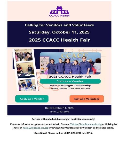 CCACC is calling on vendors and volunteers to participate in their 2025 Health Fair that will be held on Saturday, October 11, 2025. This event includes health seminars, health screenings, consultation services and exhibits from Federal and local government agencies, community service providers, and health-related organizations. (fb)