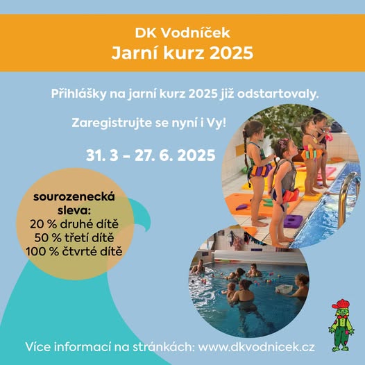 Pojďte společně s námi přivítat jaro🌸! 🌊 Nový JARNÍ KURZ plavání je tady! 🌊 Přidejte se k nám na nové lekce plavání v CVČ Vodníček! 🏊♀️✨ Kurz začíná 31. března a potrvá až do 27. června 2025. Je ideální pro všechny věkové kategorie – od začátečníků až po pokročilé plavce. 🔹 Termíny: 31. 3. – 27. 6. 2025 🔹 Místo: CVČ Vodníček 🔹 Pro koho: od 6 měsíců až do 10 let 🔹 Cíl kurzu: Zlepšení techniky plavání, kondice a zábava ve vodě! Nezmeškejte svou šanci zlepšit se ve vodě a užít si každý trénink! 🌊 Přihlaste se ještě dnes! Těšíme se na Vás. DK Vodníček #Plavání #JarníKurz #PlaváníProVšechny #AktivníŽivot #dkvodnicek (fb)
