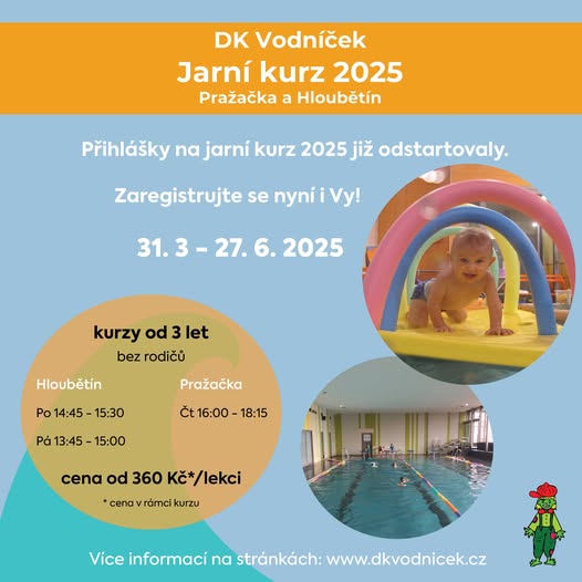 Věděli jste, že DK Vodníček plave i na bazénech na Pražačce a v Hloubětíně? 🌞 Přidejte se k nám na nové JARNÍ KURZY pro děti od 3 let! 🏊♀️🌊 Přihlašte své děti na nový jarní kurz plavání, který začíná 31. 3. 2025 a končí 27. 6. 2025. 🔹 Pro koho: děti od 3 let (bez doprovodu rodičů) 🔹 Cena: od 360 Kč za lekci v rámci kurzu 🔹 Termín: 31. 3. – 27. 6. 2025 🔹 Místa: Bazény na Pražačce a v Hloubětíně Využijte tuto skvělou příležitost pro zlepšení plaveckých dovedností vašich dětí v bezpečném a podporujícím prostředí! 😊 Nezapomeňte, místa se rychle plní – přihlaste se ještě dnes! #PlaváníProDěti #JarníKurzy #Pražačka #Hloubětín #PlaváníBezRodičů #AktivníDěti #dkvodnicek (fb)