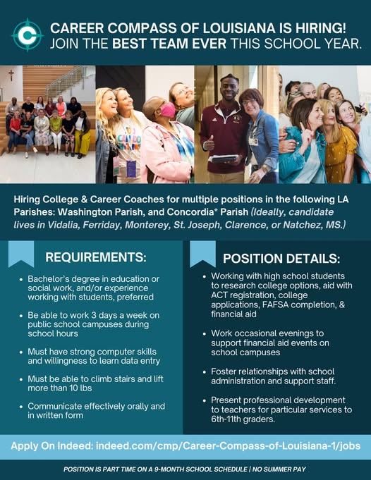 🚨 NOW HIRING: College & Career Coaches In Central and North Louisiana! 🚨 Join the best team ever and help guide students across Louisiana toward brighter futures. Career Compass of Louisiana is hiring part-time College & Career Coaches to serve high school students in several parishes across the state. If you’re passionate about education, mentorship, and helping students succeed beyond high school, this role is for you! ✨ What You'll Do: • Guide students through college & career planning • Support ACT registration, FAFSA completion & applications • Foster school relationships & deliver student support • Help host financial aid events • Present to teachers about college and career access services 🔗 Open Positions by Region: 📍 CENLA 👉 https://www.indeed.com/viewjob?jk=6874609cde0da1da&from=shareddesktop_copy 📍 North LA 👉 https://www.indeed.com/viewjob?jk=4caf902670172d7c&from=shareddesktop_copy (fb)
