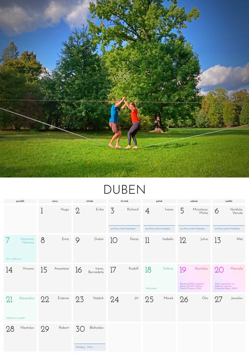 SLACKALENDÁŘ 2025 📆 Ahoj všem, stejně jako loni, tak i letos, pro vás chystáme lajnerský kalendář 🥳 Tentokrát jsme si troufli na větší formát A3, půlka pro fotku a půlka pro kalendárium. Budete mít na očích, kdo má svátek, kdy si máte nakoupit kvůli státním svátkům nebo zavzpomínáte na významná slackline jubilea 😇 V kalendáři je dost místa, kam si můžete zapisovat vaše nadcházející události. Pár akcí v příštím roce jsme už přidali, abyste nezapomněli 😘 Kalendář půjde do tisku příští týden a orientační cena je 100,- Kč. Prosíme, kdo máte zájem, napište nám přes Messenger, Discord nebo na mail info@ceska-asociace-slackline.cz . Těšíme se na výsledek a doufáme, že se vám bude kalendář líbit :-) P.S. Máš pěknou fotku? Víš o chystané akci, která by neměla v kalendáři chybět? A nebo rád vzpomínáš na významný den slackliningu? Doraž na Discord a poděl se s námi!🙏 https://discord.gg/2qkx3N9787 (fb)
